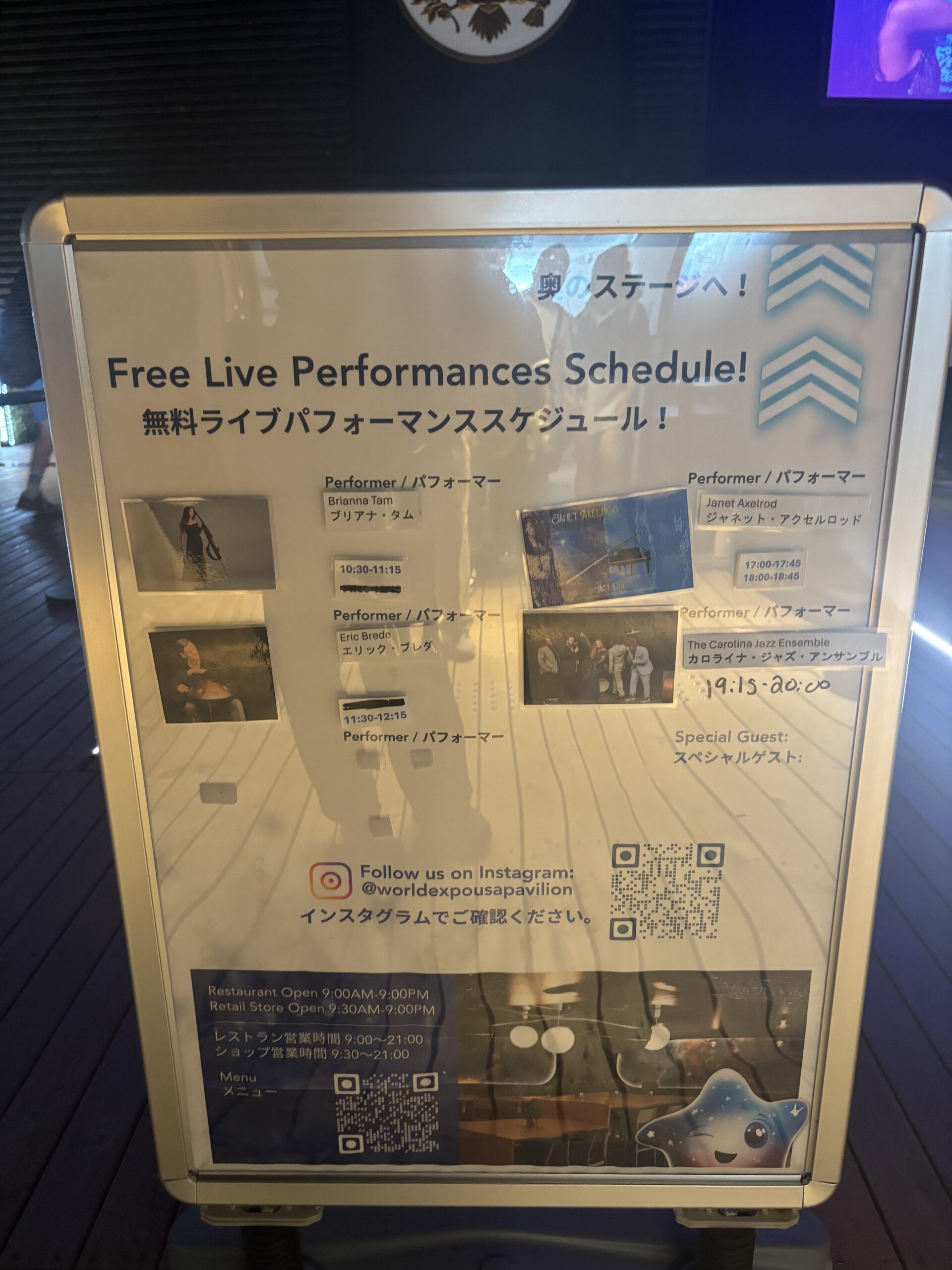 出口から出ると、レストラン(テイクアウトもあります)やライブパフォーマンスのステージがあったりと楽しそうな雰囲気。レストランやステージは、パビリオンを見ていない人でも入れるそうです。